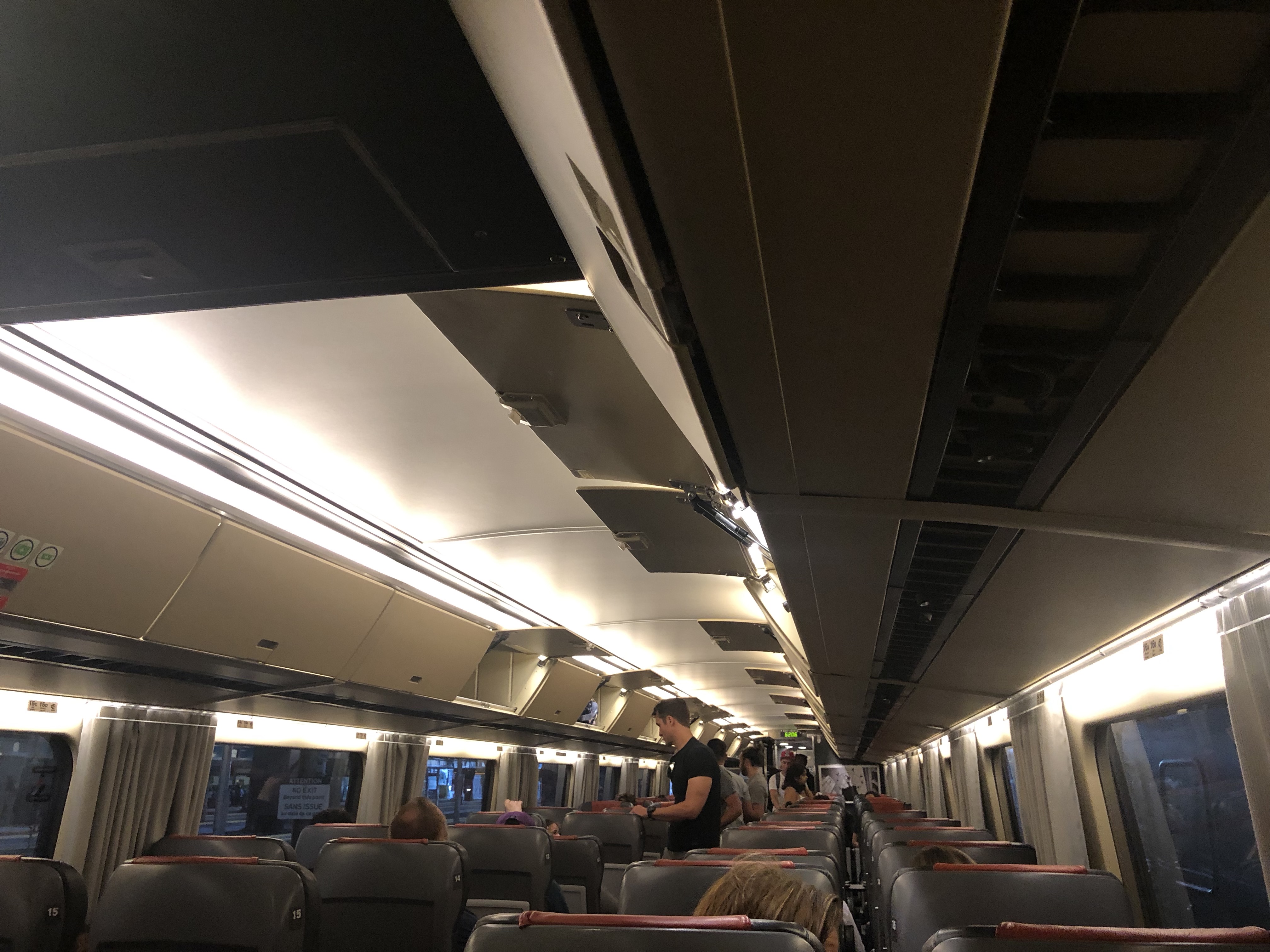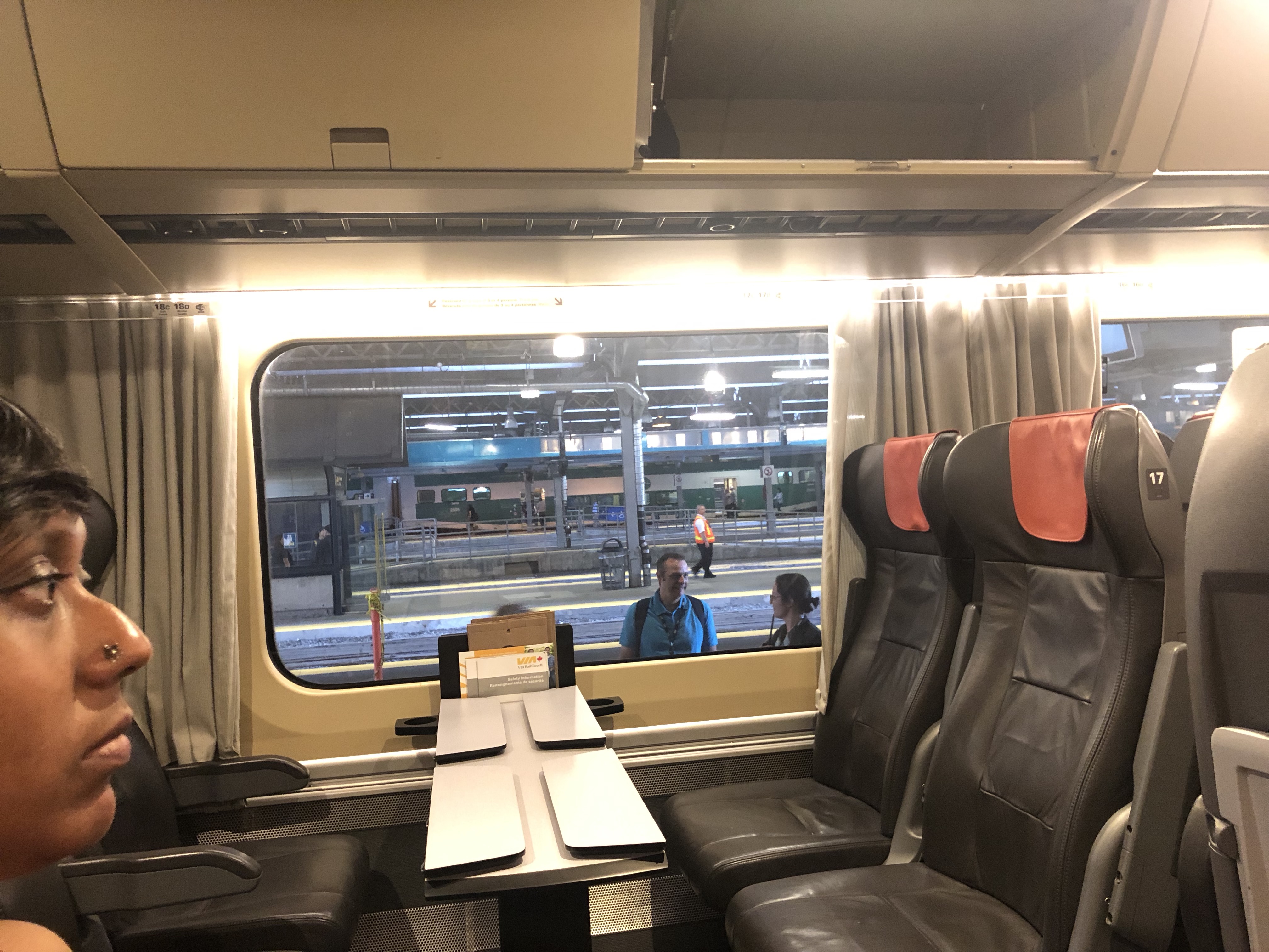 Finally a pretty girl in uniform came with a scanner in hand to check all our tickets and separated mothers with small children to the front of the line so that they get first priority. We waited patiently to get on to the escalator .. to climb onto the “actual” platform. Ten minutes prior to the departure time, we went up. Every compartment had a male and female attendants who directed and helped people to board. As we got into the compartment, the first slot was for large baggages and we could keep our suitcase there and moved on to our seats.